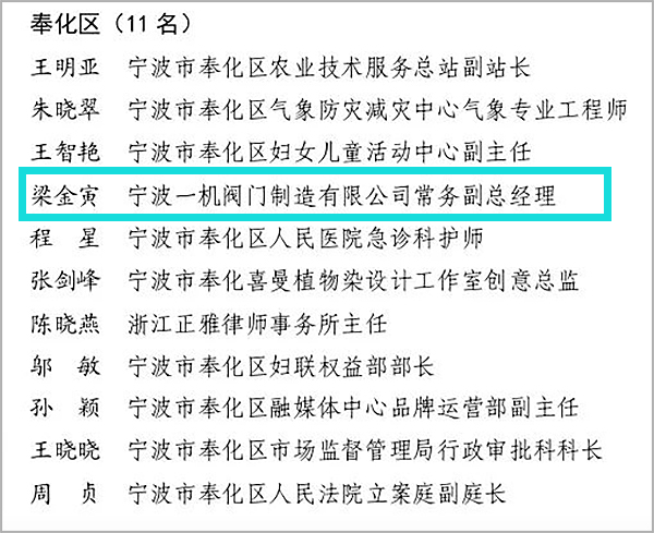 為深入學(xué)習(xí)貫徹習(xí)近平新時(shí)代中國(guó)特色社會(huì)主義思想和黨的十九屆歷次全會(huì)精神,進(jìn)一步鼓勵(lì)廣大婦女愛(ài)崗敬業(yè)、創(chuàng)先爭(zhēng)優(yōu),推動(dòng)形成學(xué)本領(lǐng)、提素質(zhì)、講奉獻(xiàn)、比業(yè)績(jī)的良好氛圍,為寧波高質(zhì)量發(fā)展建設(shè)共同富裕先行市貢獻(xiàn)半邊天力量。近日,寧波市婦聯(lián)評(píng)選認(rèn)定了200人為寧波巾幗建功標(biāo)兵,奉化區(qū)11名優(yōu)秀女性獲此殊榮,寧波一機(jī)閥門制造有限公司常務(wù)副總經(jīng)理——梁金寅,成功入選。