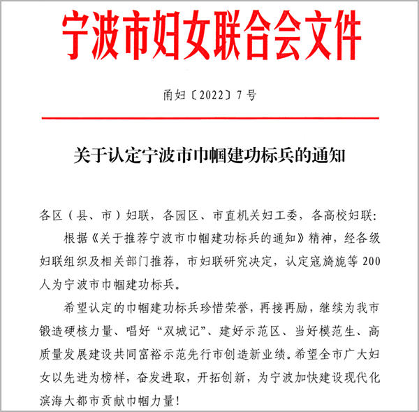 為深入學(xué)習(xí)貫徹習(xí)近平新時(shí)代中國(guó)特色社會(huì)主義思想和黨的十九屆歷次全會(huì)精神,進(jìn)一步鼓勵(lì)廣大婦女愛(ài)崗敬業(yè)、創(chuàng)先爭(zhēng)優(yōu),推動(dòng)形成學(xué)本領(lǐng)、提素質(zhì)、講奉獻(xiàn)、比業(yè)績(jī)的良好氛圍,為寧波高質(zhì)量發(fā)展建設(shè)共同富裕先行市貢獻(xiàn)半邊天力量。近日,寧波市婦聯(lián)評(píng)選認(rèn)定了200人為寧波巾幗建功標(biāo)兵,奉化區(qū)11名優(yōu)秀女性獲此殊榮,寧波一機(jī)閥門制造有限公司常務(wù)副總經(jīng)理——梁金寅,成功入選。