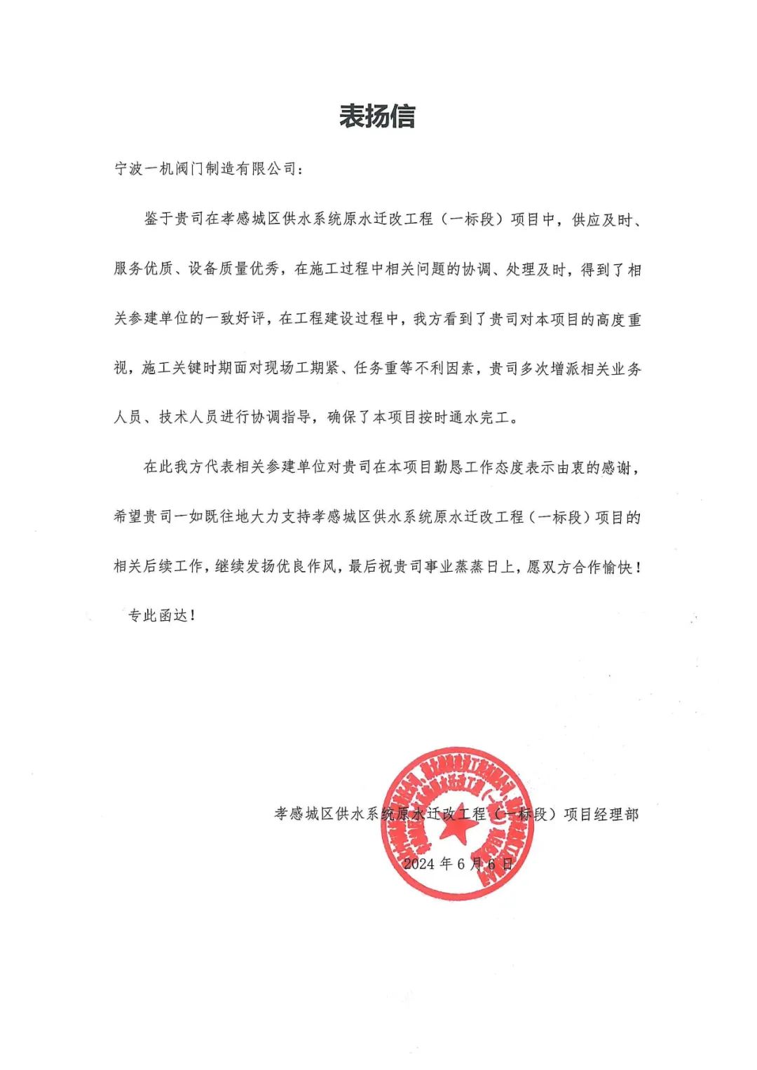 一機(jī)閥門(mén),一直以來(lái)都是行業(yè)內(nèi)的佼佼者,其以精湛的技術(shù)、卓越的品質(zhì)和一流的服務(wù)而聞名。這份榮耀并非偶然,而是無(wú)數(shù)一機(jī)人共同努力的結(jié)果。此次湖北孝感城區(qū)供水系統(tǒng)原水遷改工程項(xiàng)目總投資13.17億元,是孝感有史以來(lái)單項(xiàng)投資最大的一項(xiàng)民生工程,項(xiàng)目包含原水取水工程、原水預(yù)處理工程、原水輸水管道工程等3個(gè)子項(xiàng)目。項(xiàng)目建成通水后,漢江供水源取水能力將由每日23萬(wàn)噸增加至46萬(wàn)噸,供水服務(wù)面積將超過(guò)100平方公里,惠及孝感主城區(qū)、高新區(qū)、臨空經(jīng)濟(jì)區(qū)、孝南經(jīng)濟(jì)開(kāi)發(fā)區(qū)、孝南區(qū)部分鄉(xiāng)鎮(zhèn)及云夢(mèng)縣城區(qū)和鄉(xiāng)鎮(zhèn)約80萬(wàn)人口,有力提高孝感高質(zhì)量發(fā)展的水資源承載能力。按照市委市政府要求,工程由澴川國(guó)投集團(tuán)黨委統(tǒng)一安排,在確保質(zhì)量、安全的前提下,應(yīng)快盡快,確保民生工程優(yōu)先完工,力保24年3月底前實(shí)現(xiàn)試通水,6月項(xiàng)目全面完工正式通水,讓市民群眾早日吃上更加優(yōu)質(zhì)的“放心水”。
